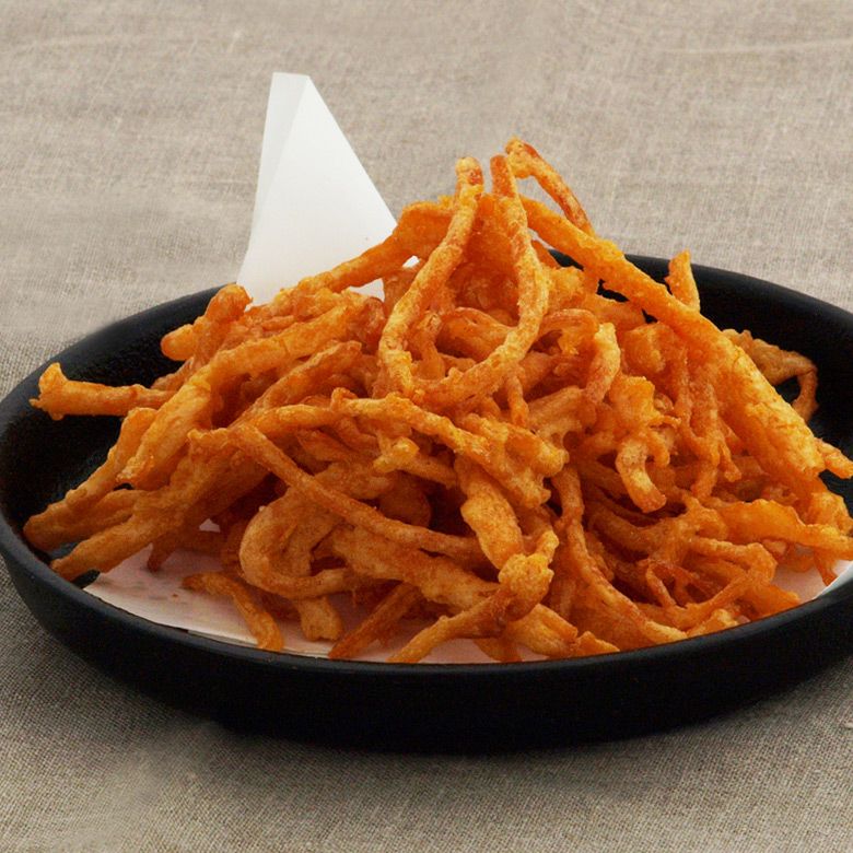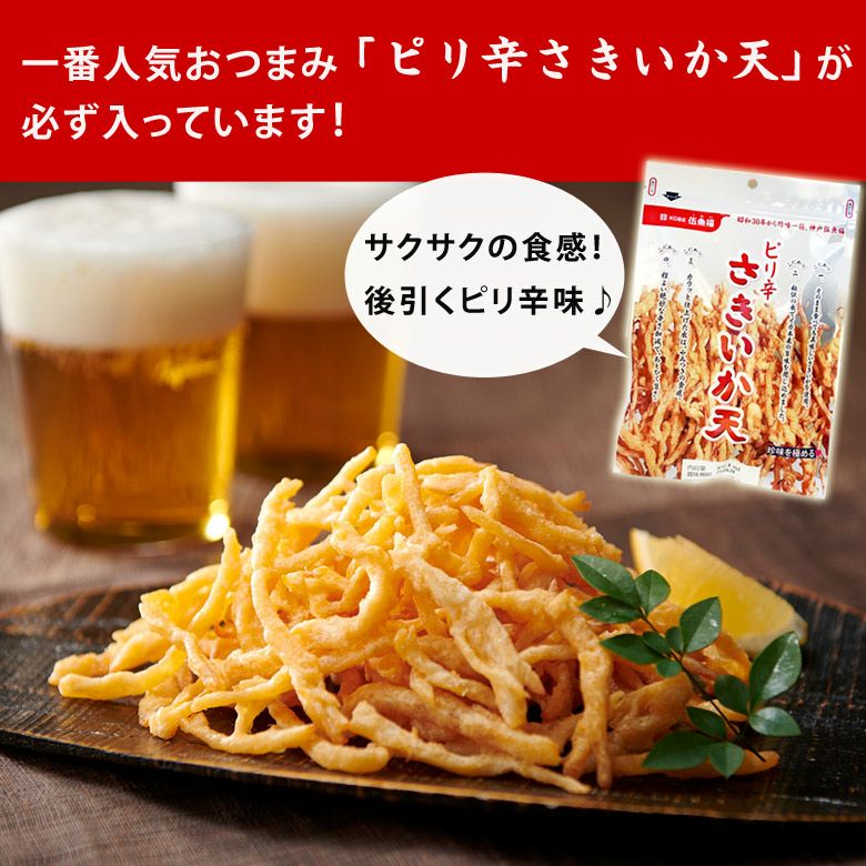 400品のおつまみの中で一番人気ビールがすすむ「ピリ辛さきか天」、北海道産クリームチーズを